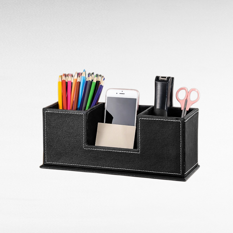 Factory Wholesale Simple Style Leather Dual Pen Cup and Drawer Storage Organizer for Stationery